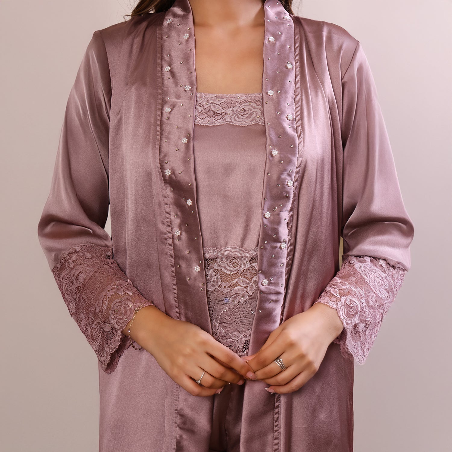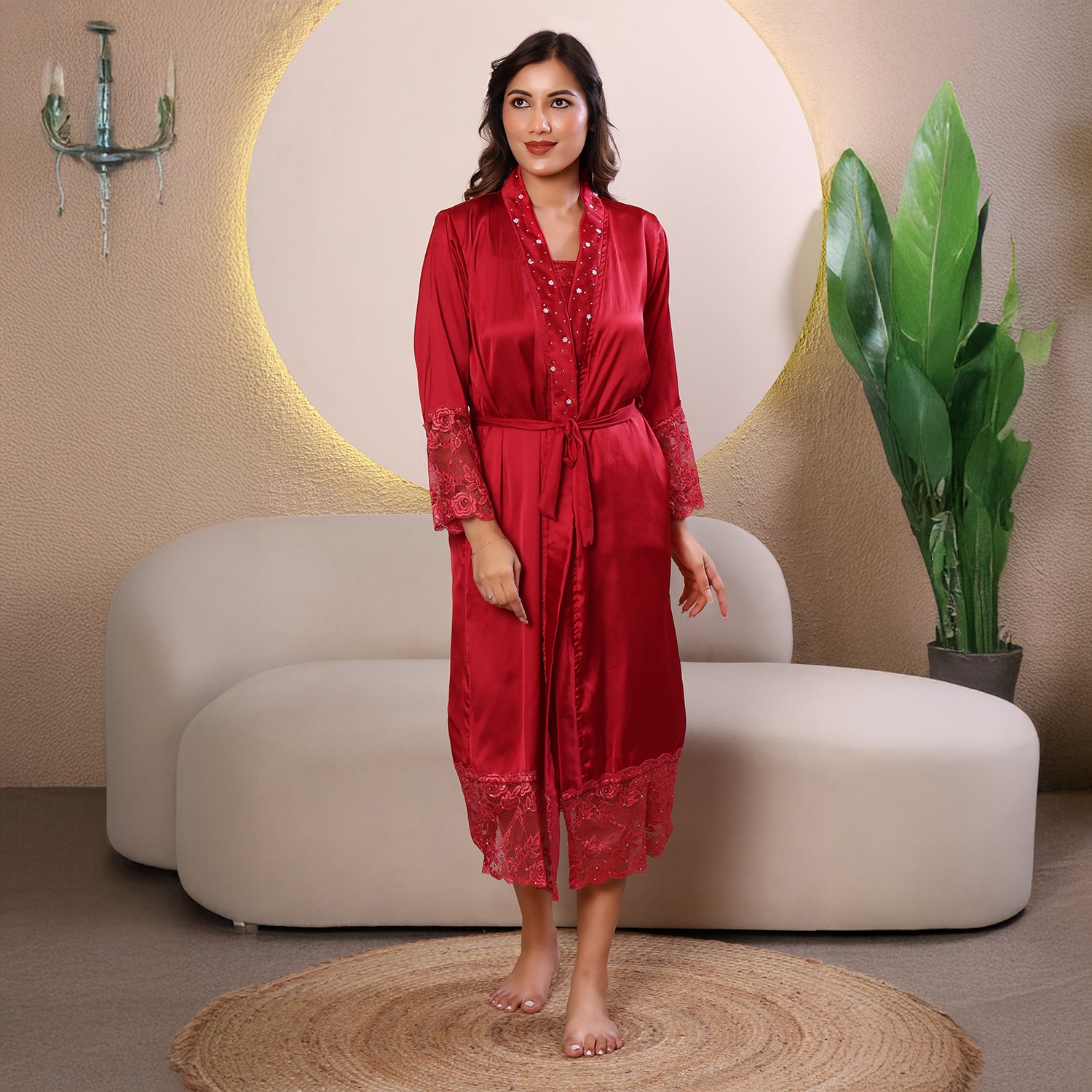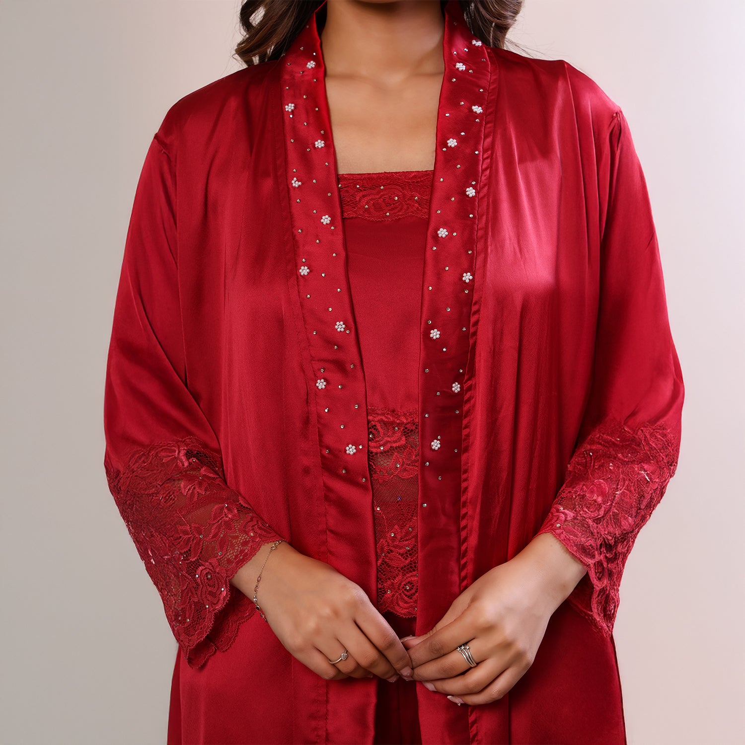 Design:- Knee length kimono with lace and hand-embellished beads.