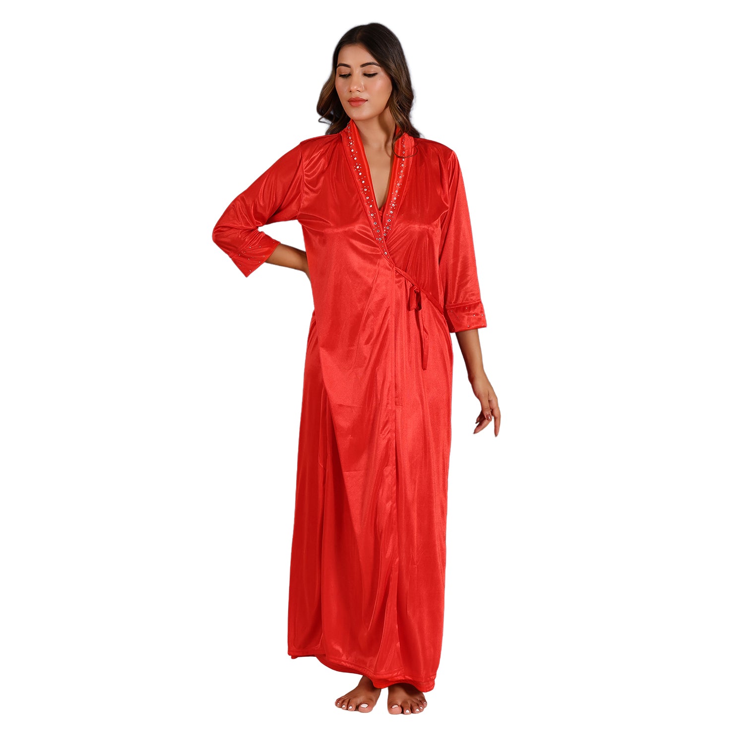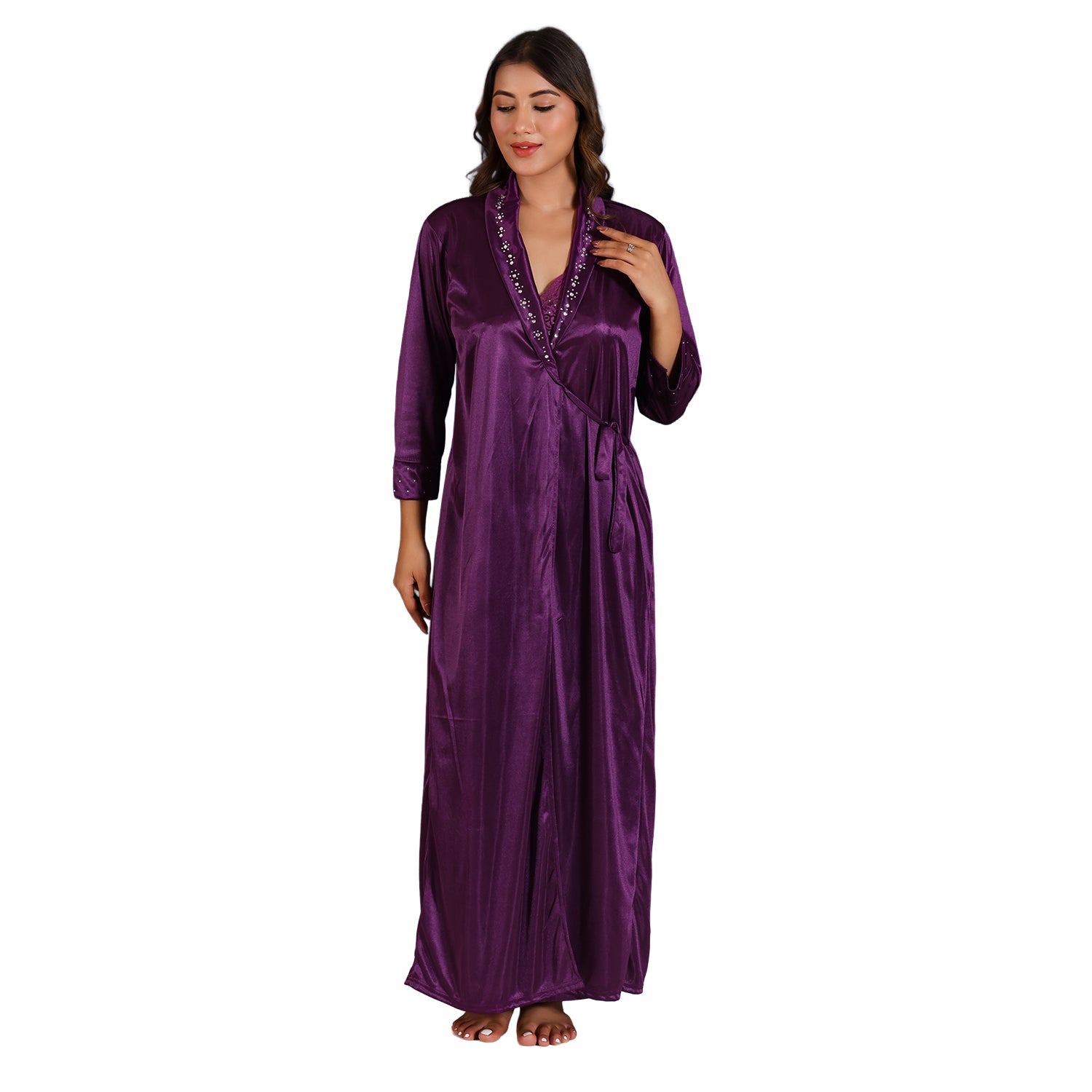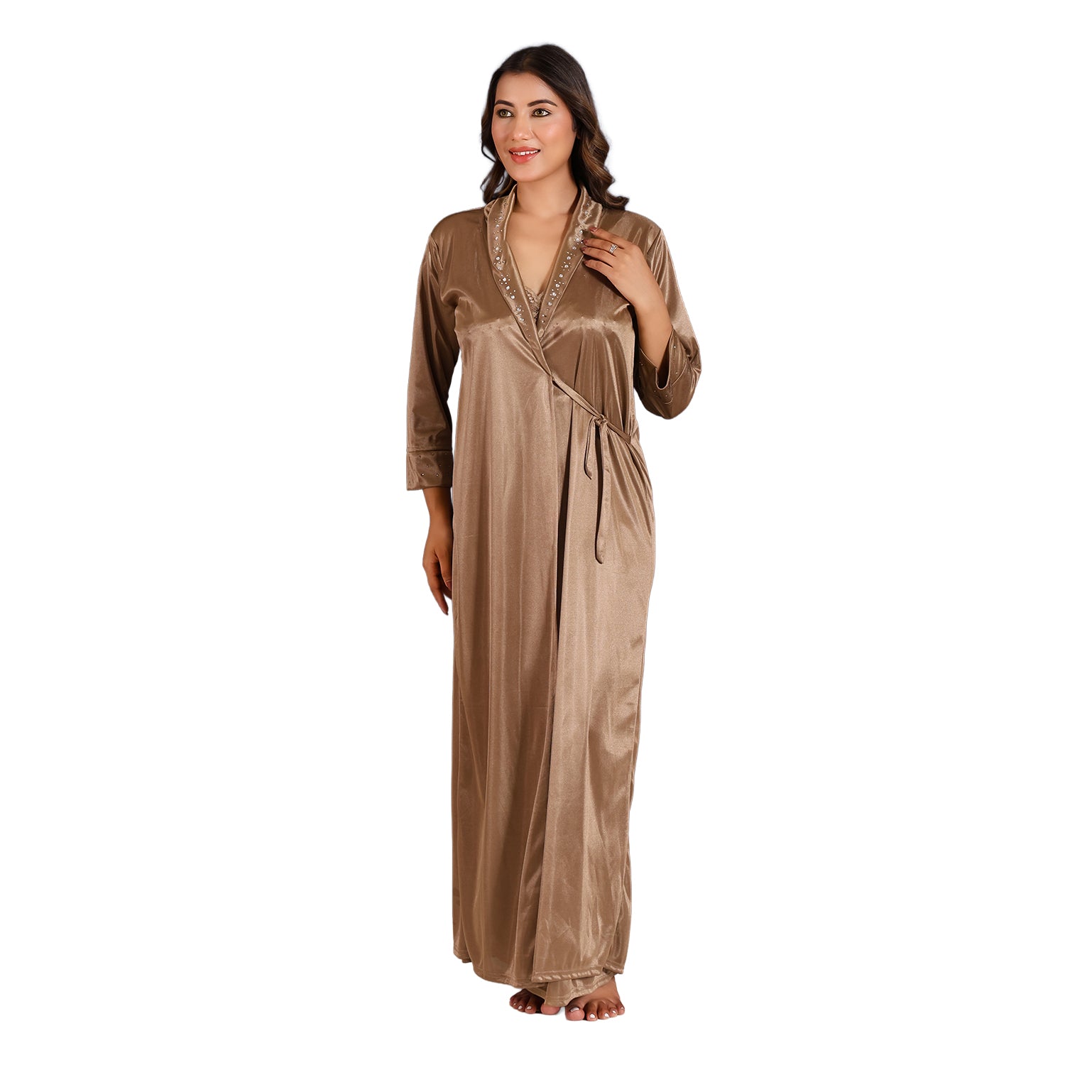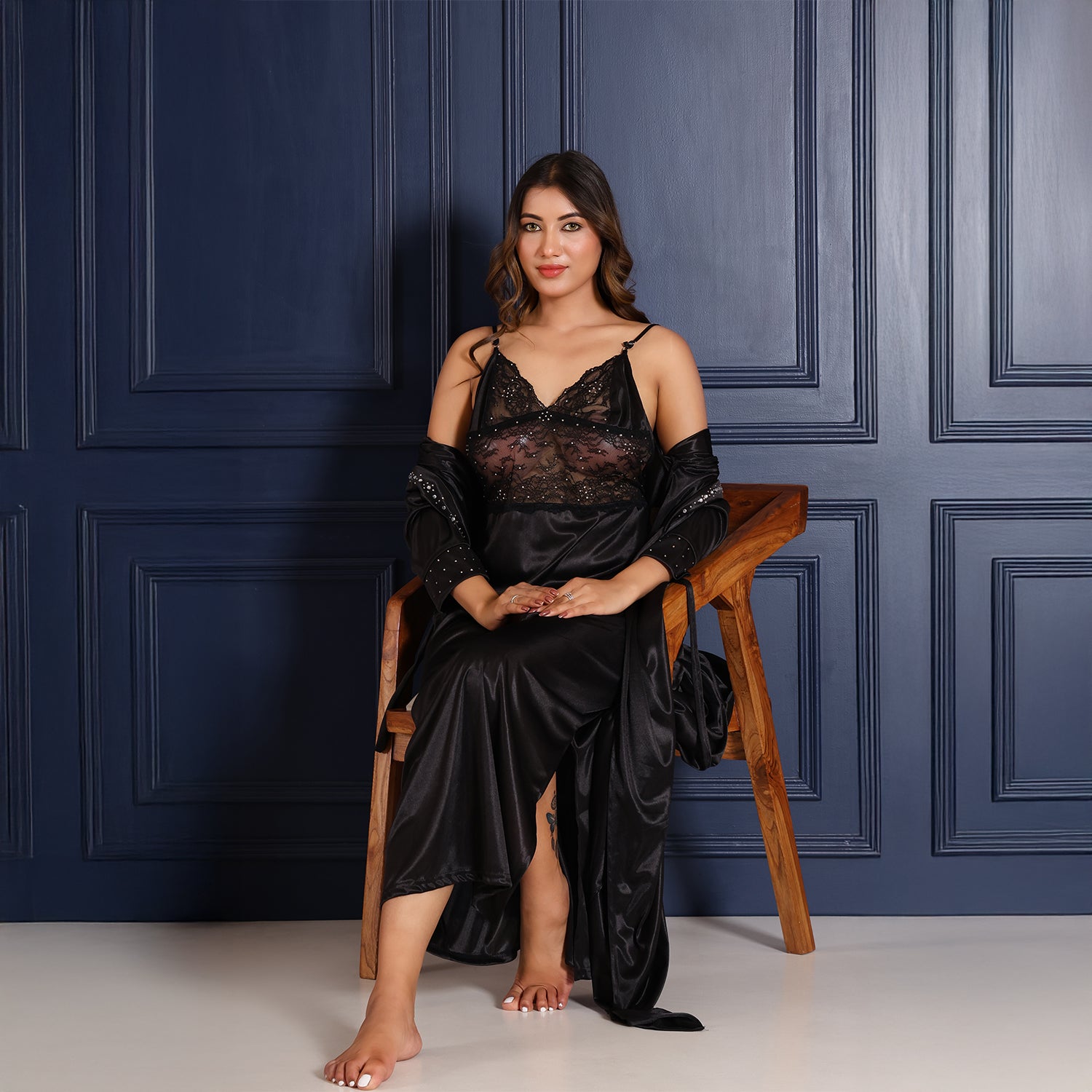 Women Nighty Satin Net Gown with Robe (Stone Flower)