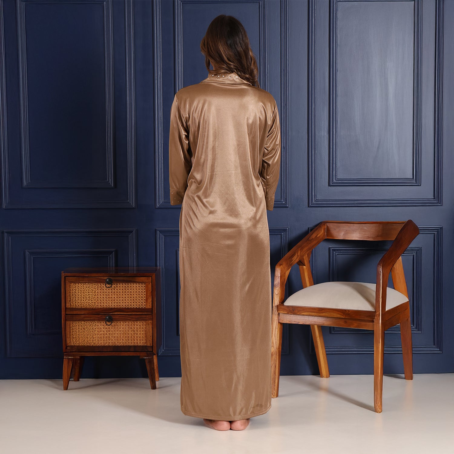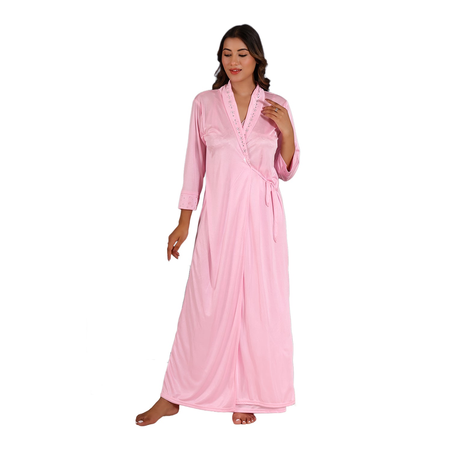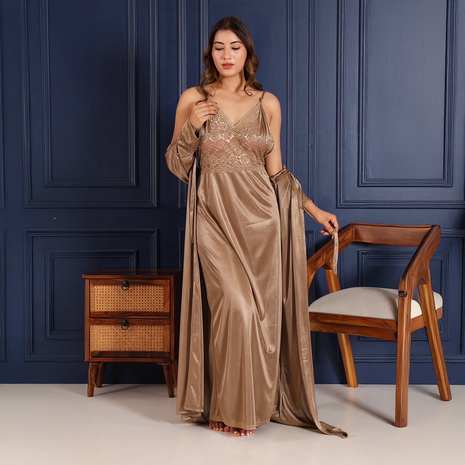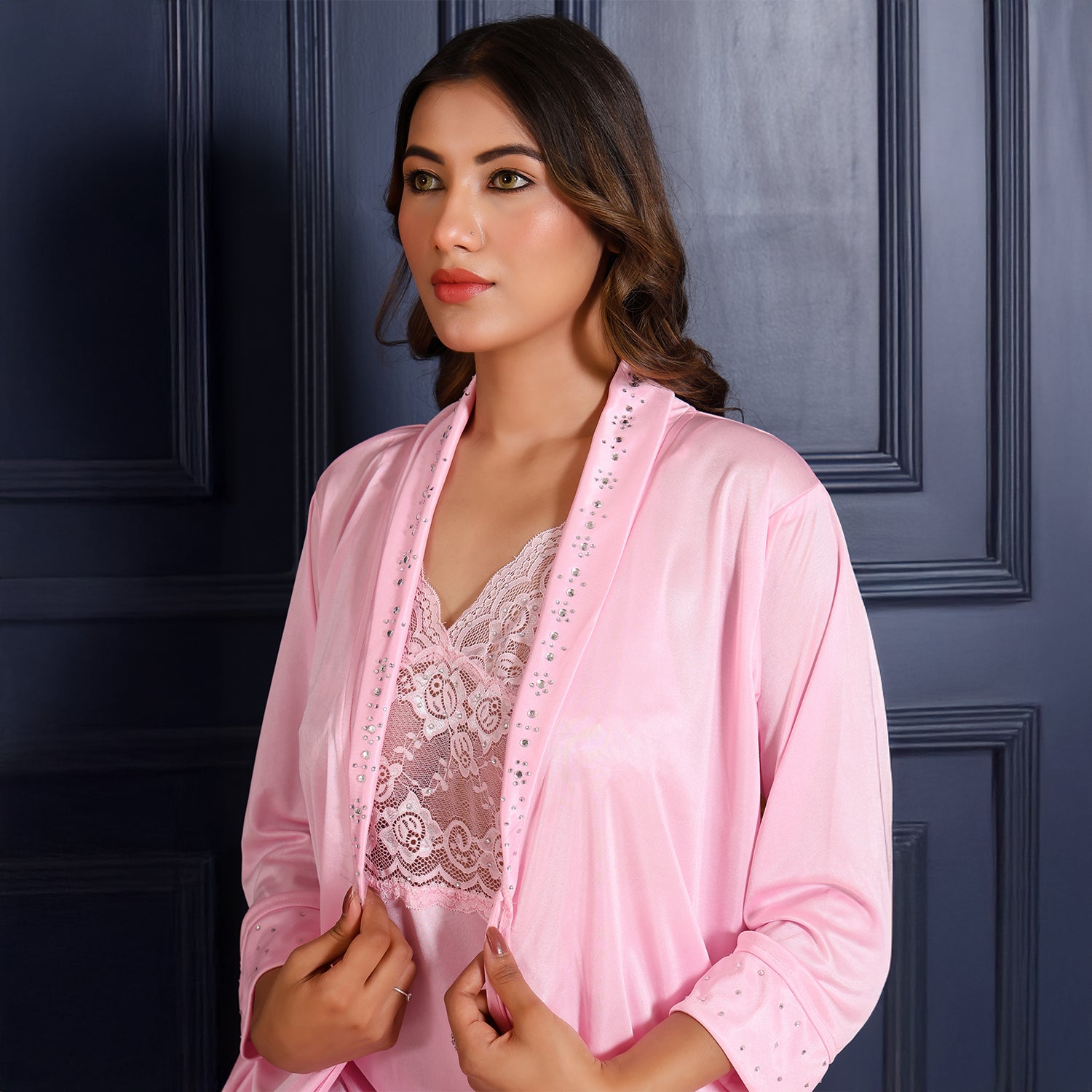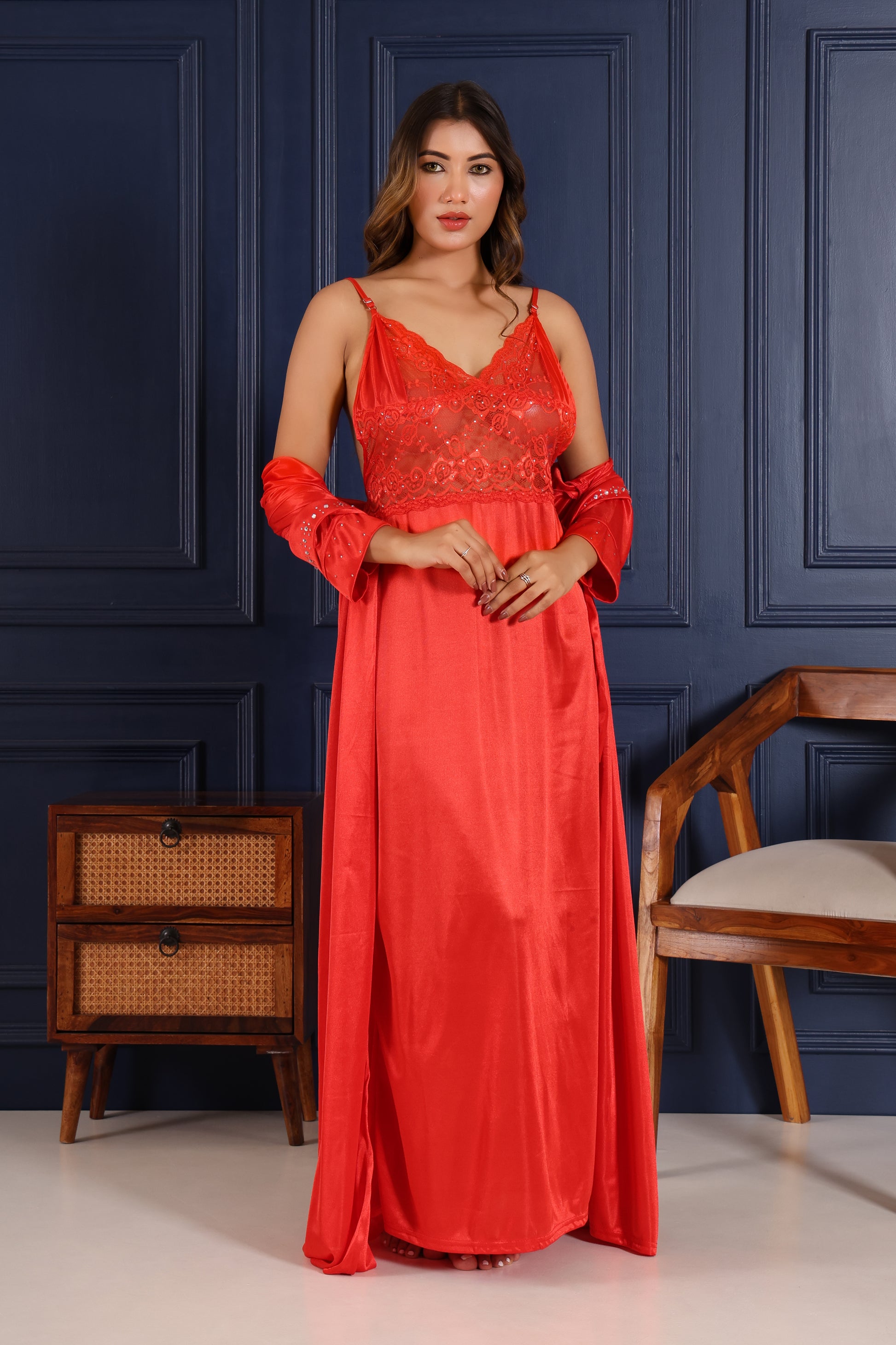 Women Nighty Satin Net Gown with Robe (Stone Flower)