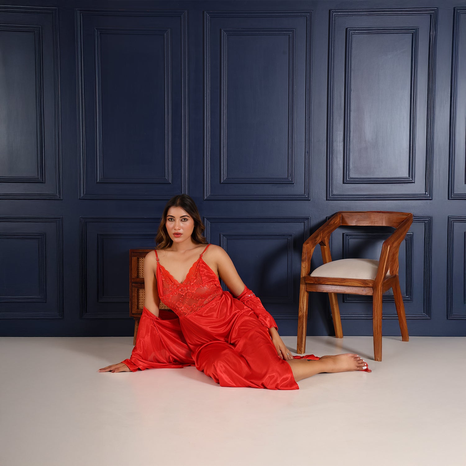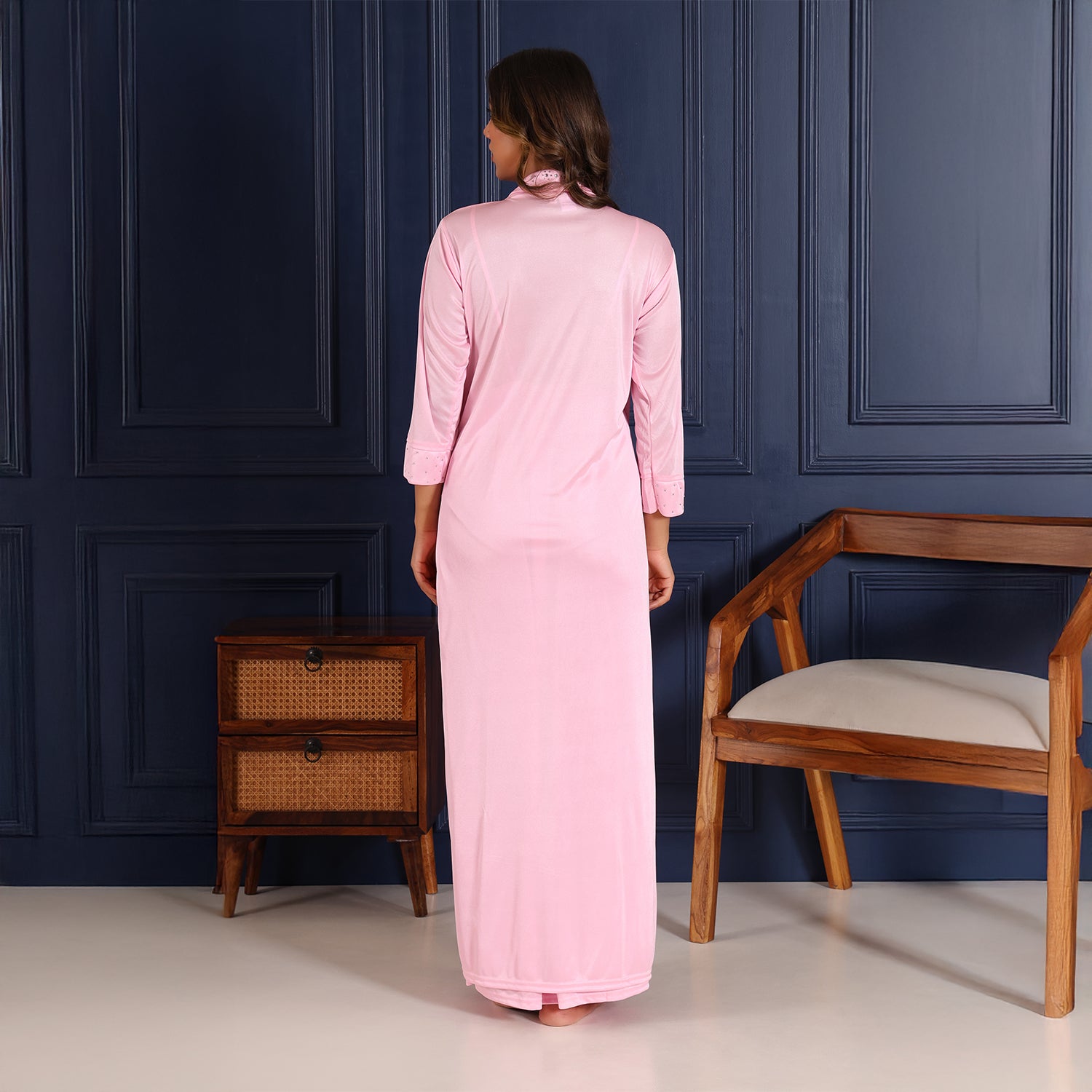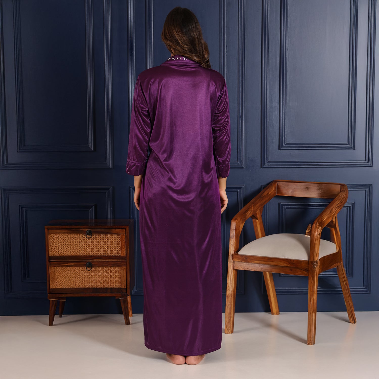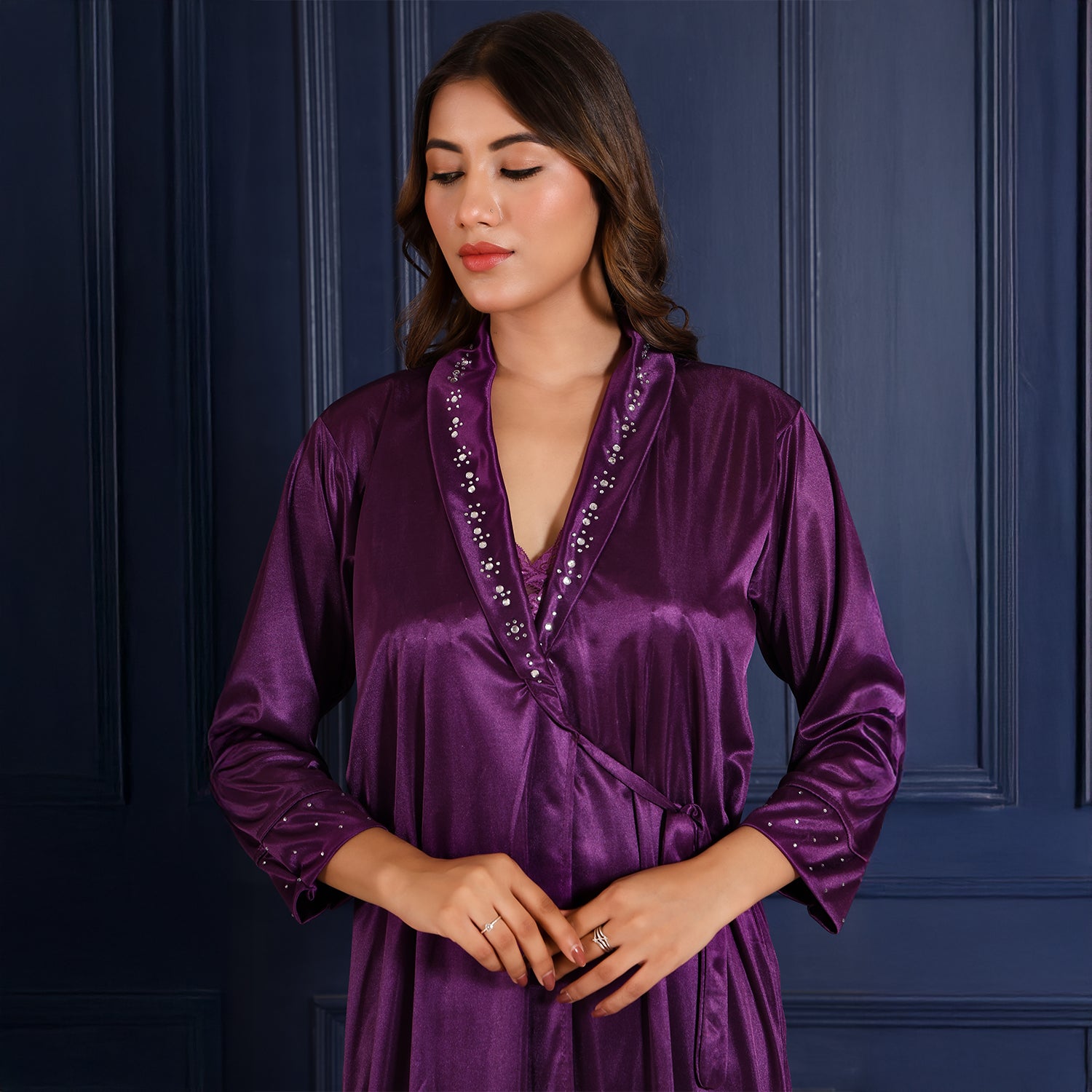 Women Nighty Satin Net Gown with Robe (Stone Flower)