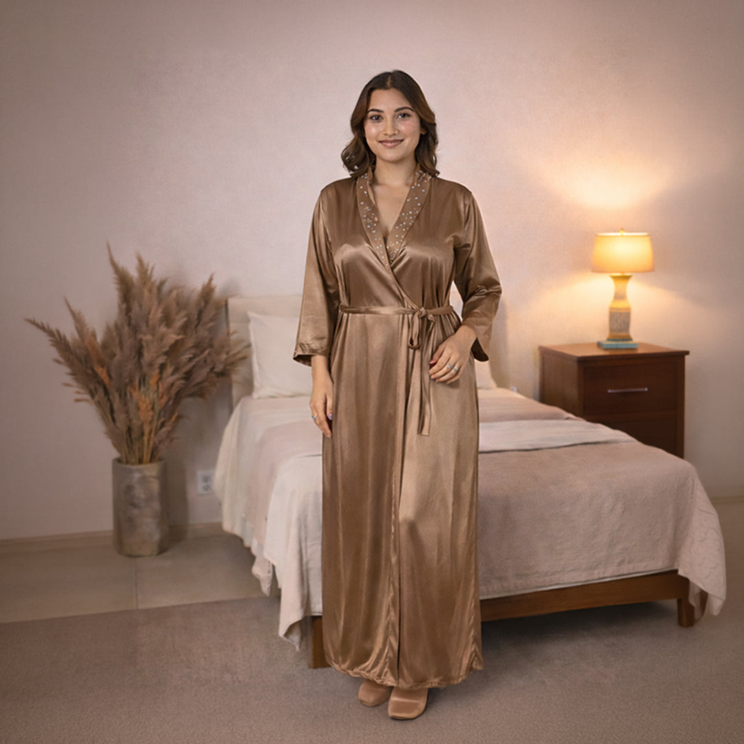 House of Elorra presents a specially designed premium satin nightdress, crafted to make every bride feel extraordinary on her most special day. This nightdress features a graceful ankle-length silhouette, soft flowing sleeves, delicate lace trims, and a relaxed robe-style fit that flatters every figure. The luxurious satin fabric is feather-light and smooth—perfect for soothing bridal mornings and creating unforgettable moments. Hand worked shimmering Swarovski crystals add a touch of luxury and timeless elegance to the dress.