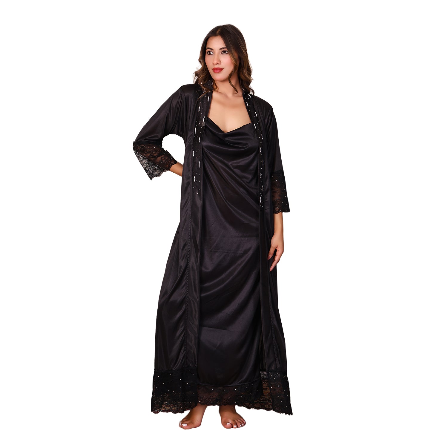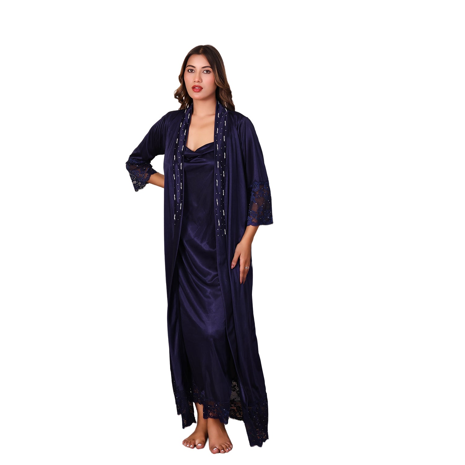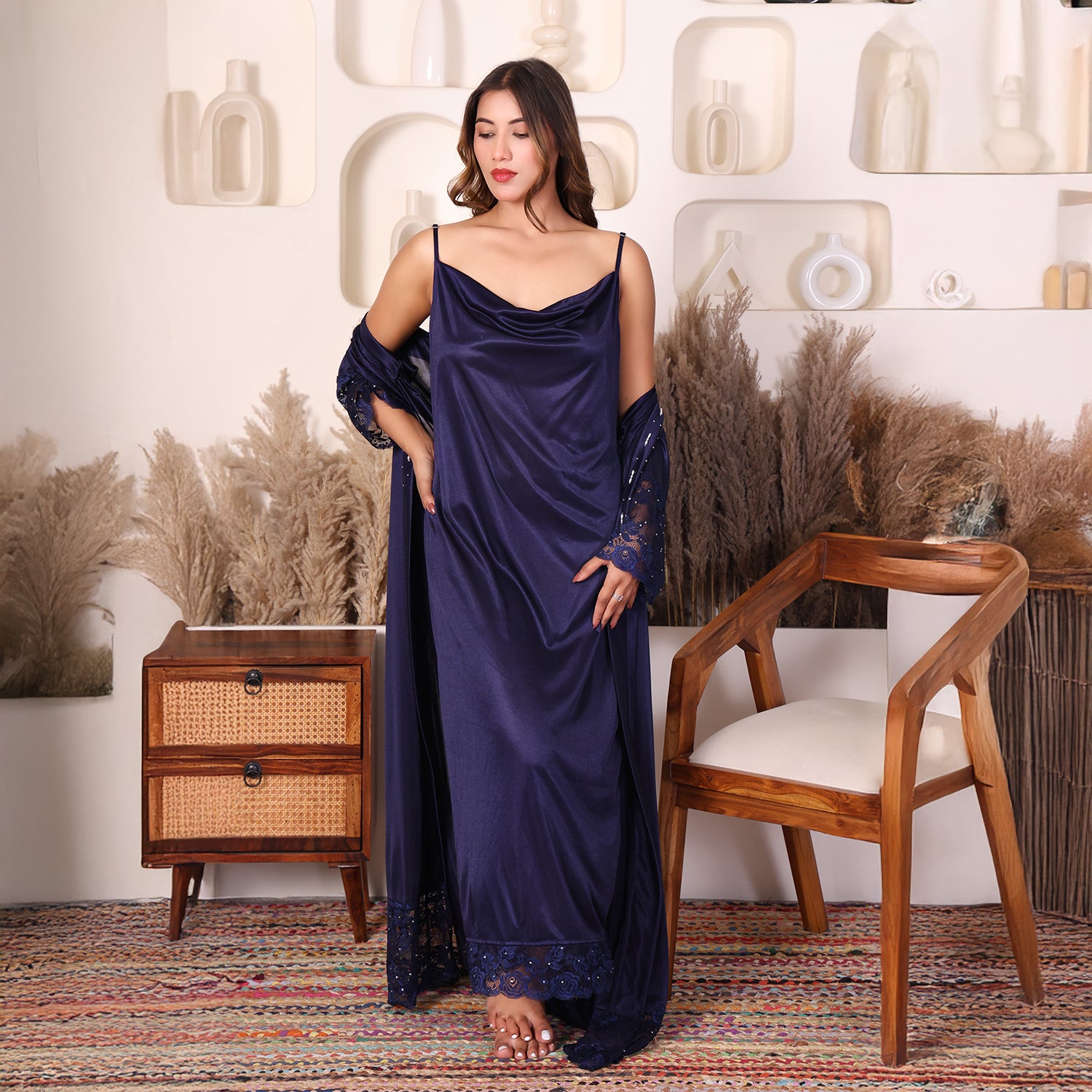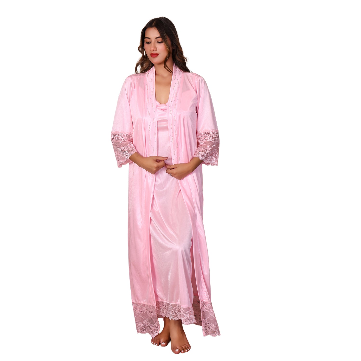 Women Satin Nightdress with Crystal And Pearl (long pearl)