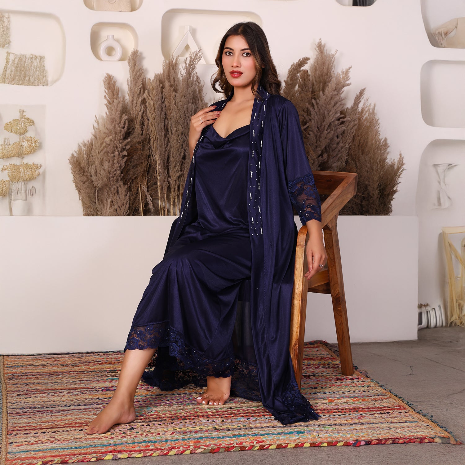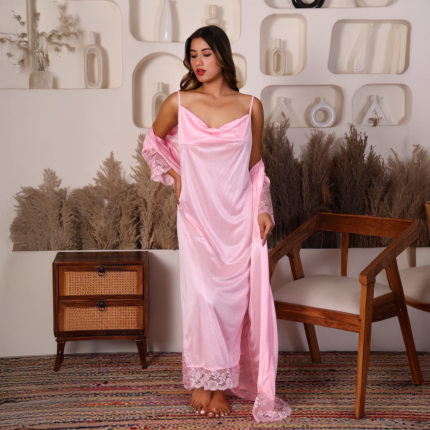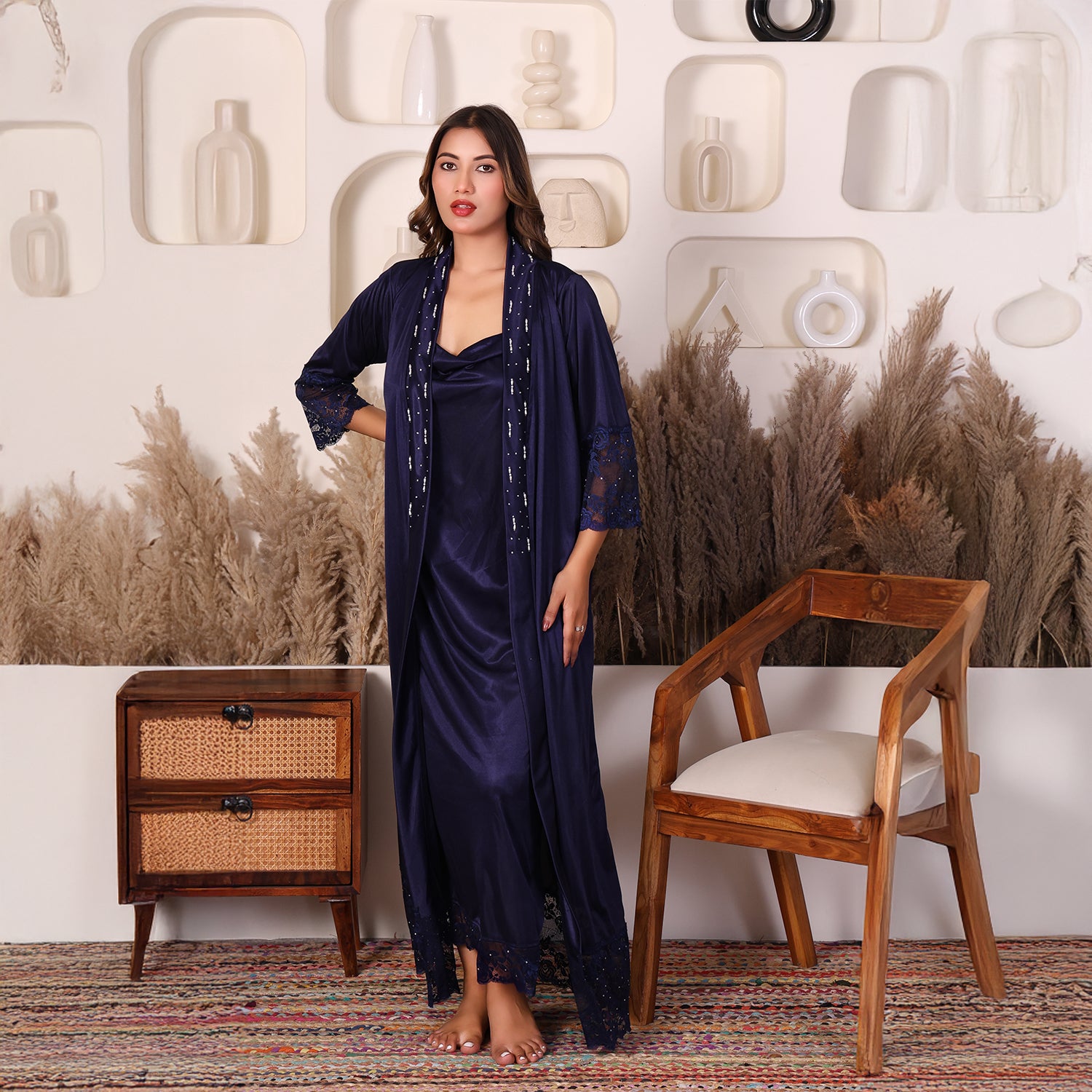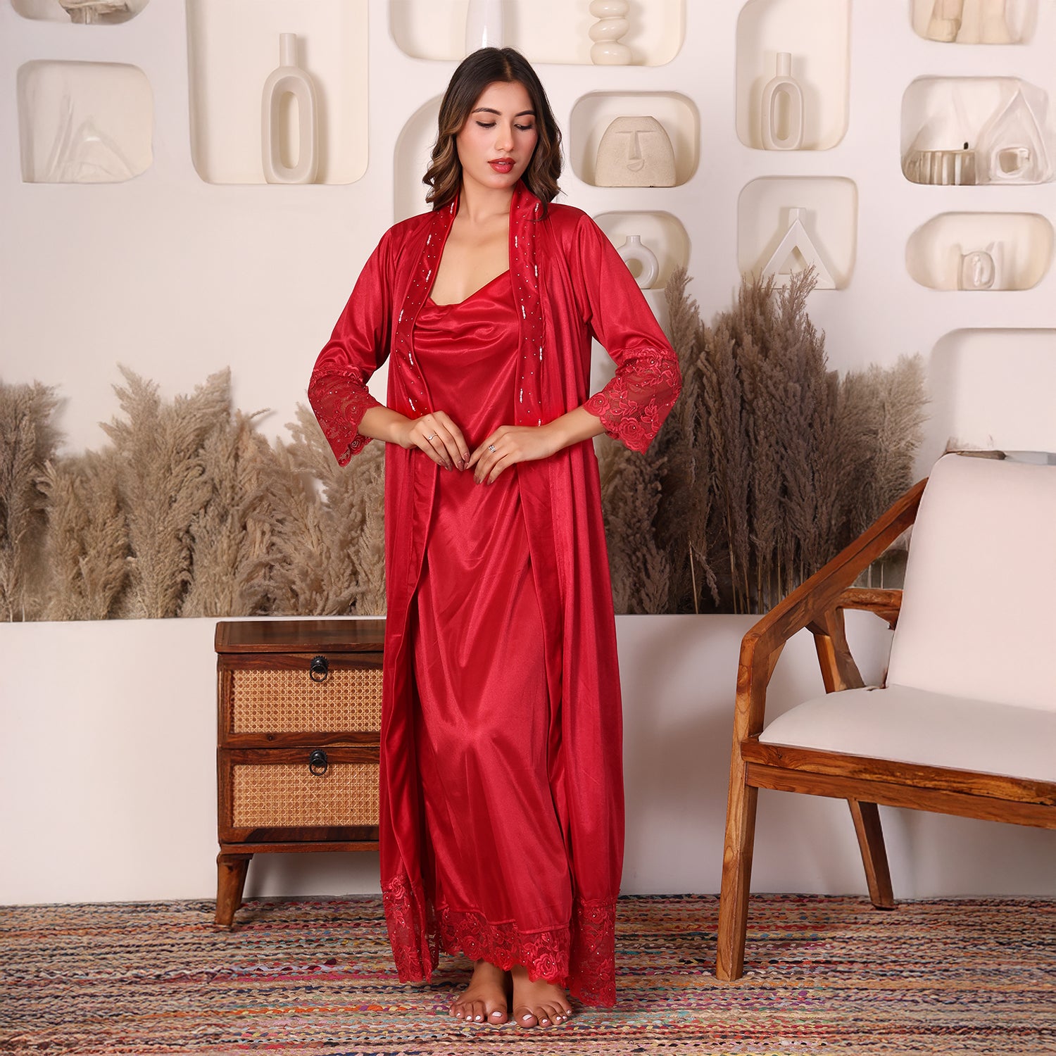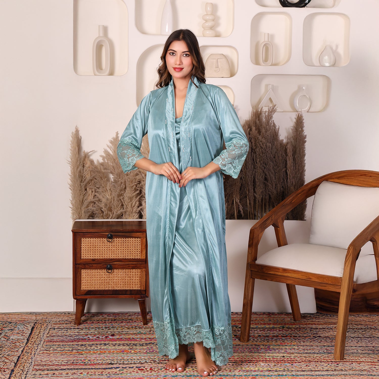 Women Satin Nightdress with Crystal And Pearl (long pearl)