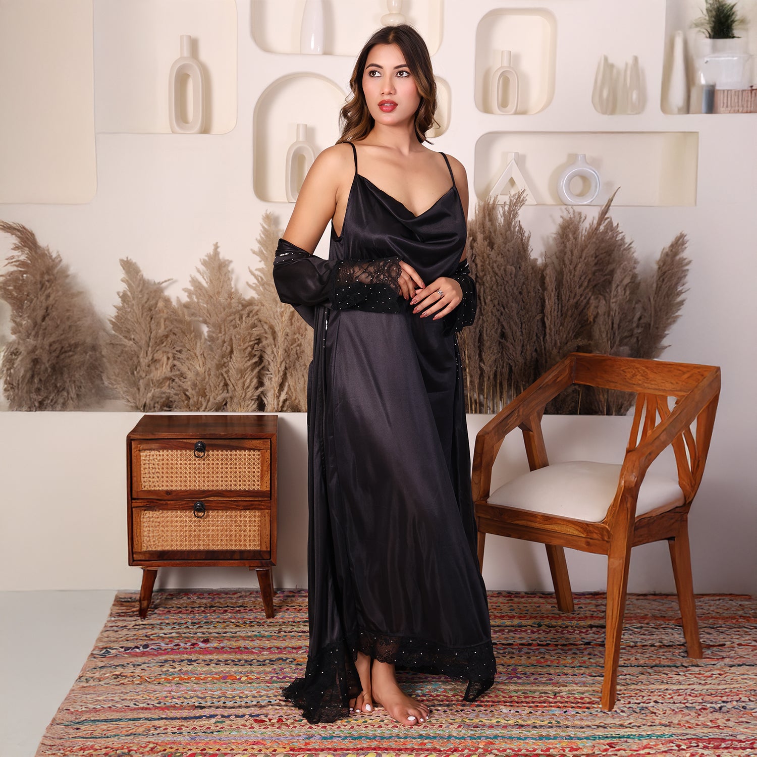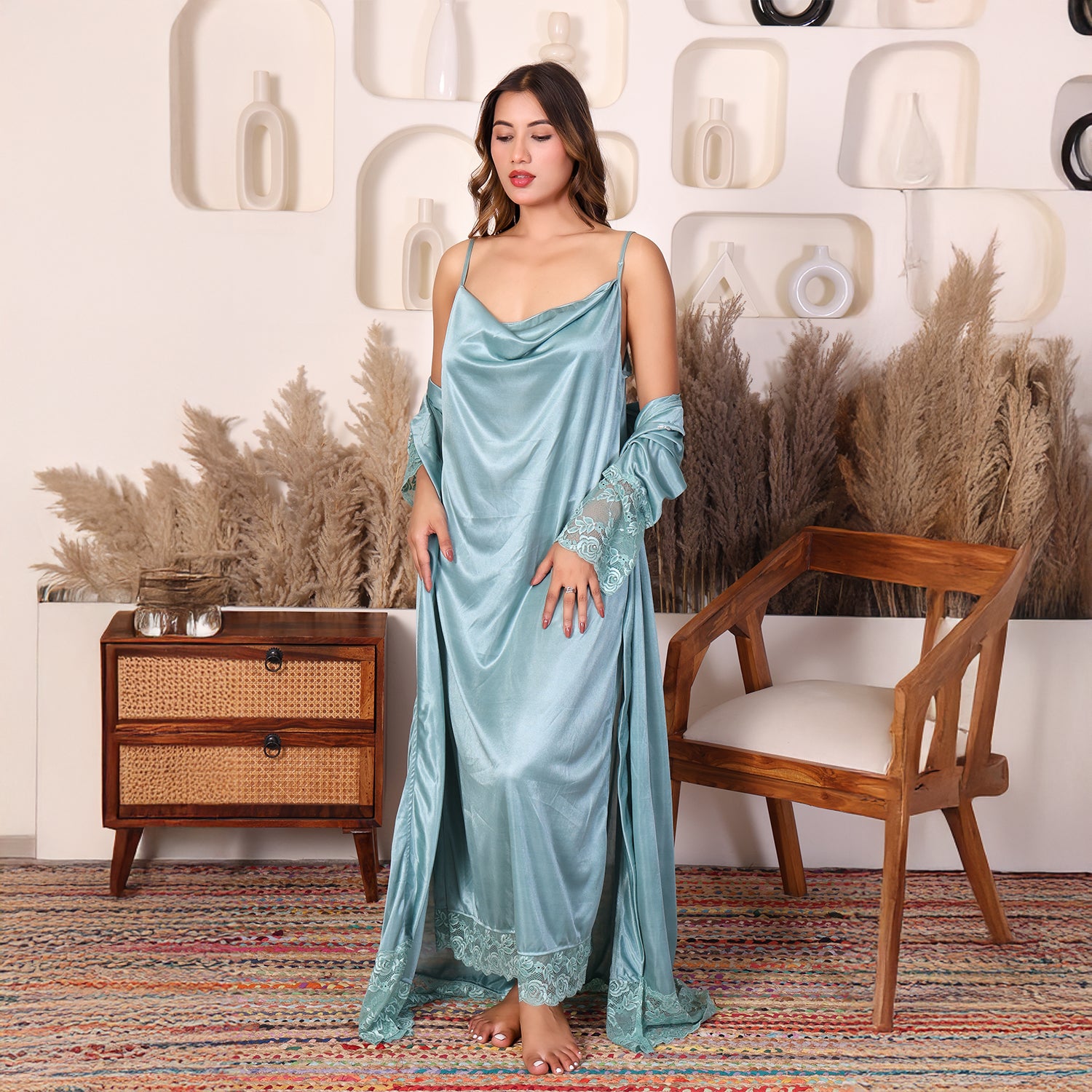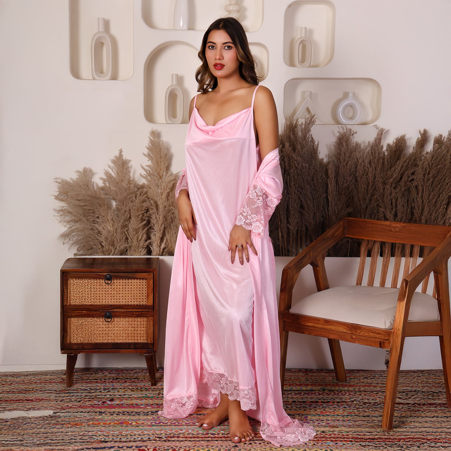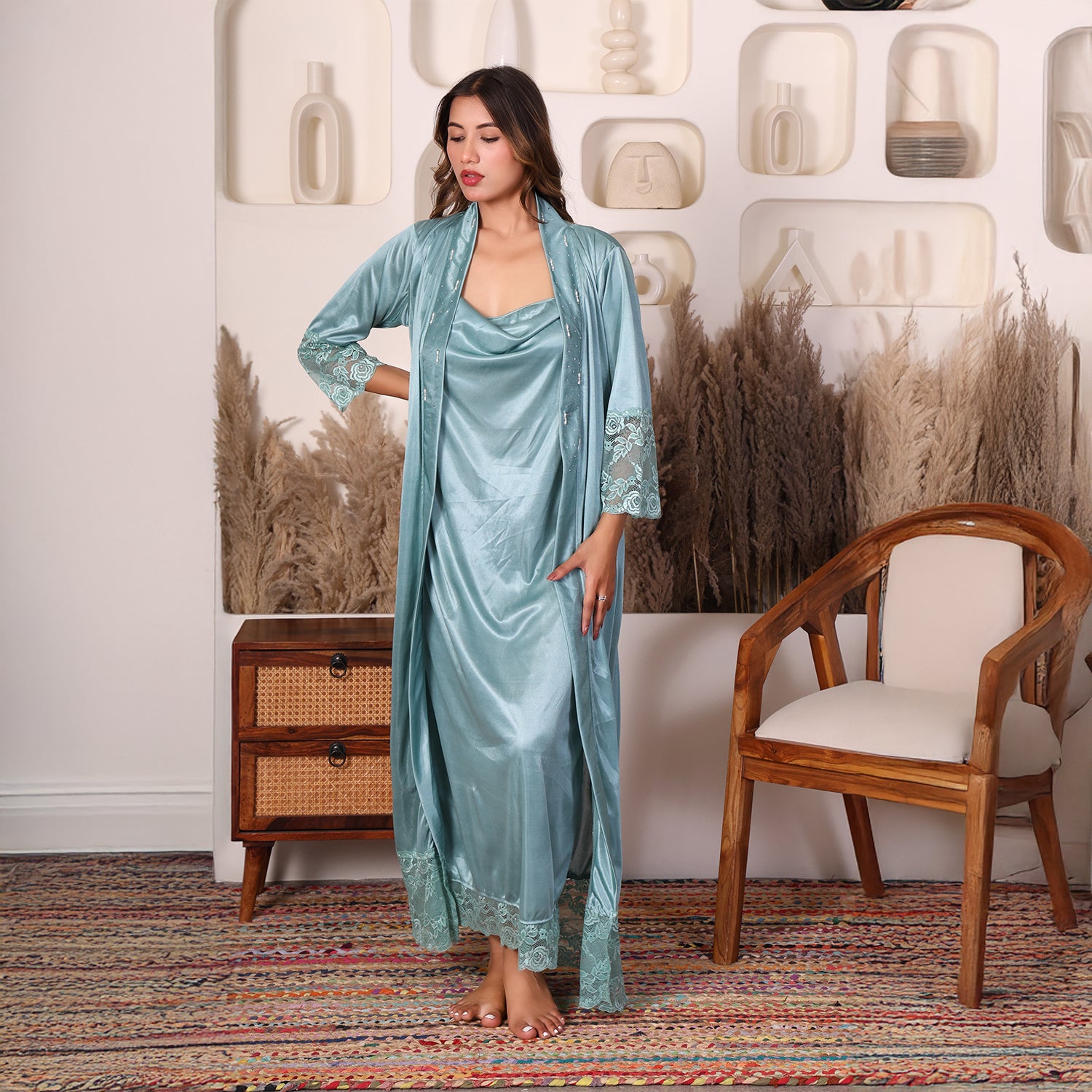 Women Satin Nightdress with Crystal And Pearl (long pearl)