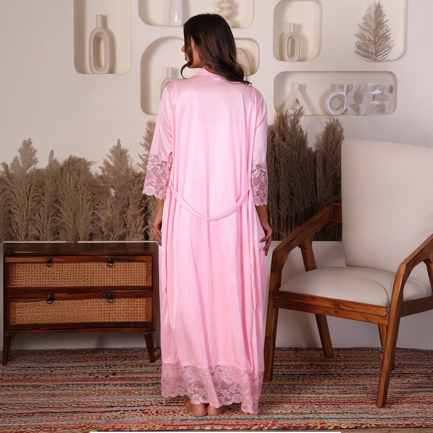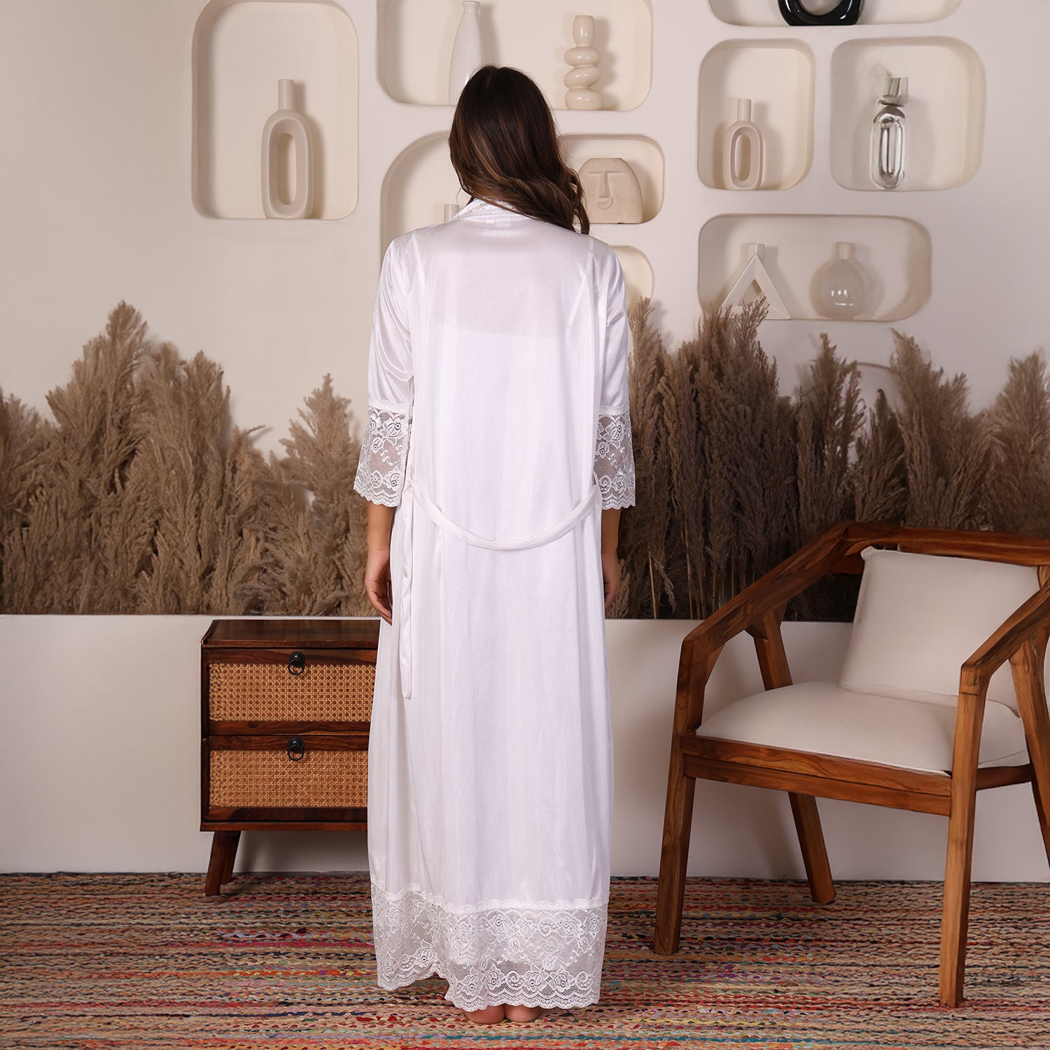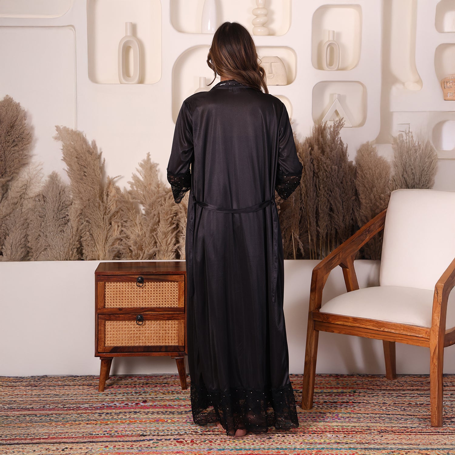 - Design:- Long ankle length kimono with lace and hand-embellished beads.