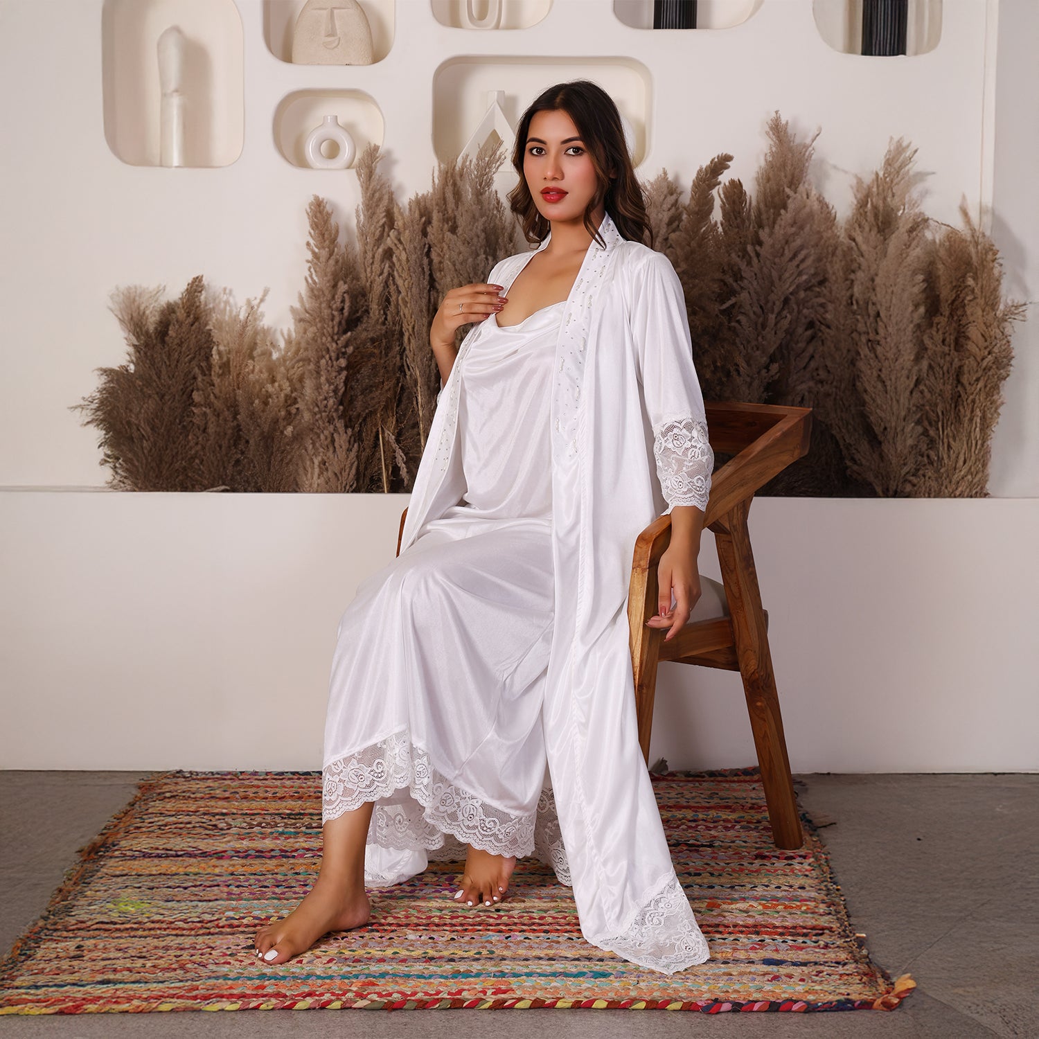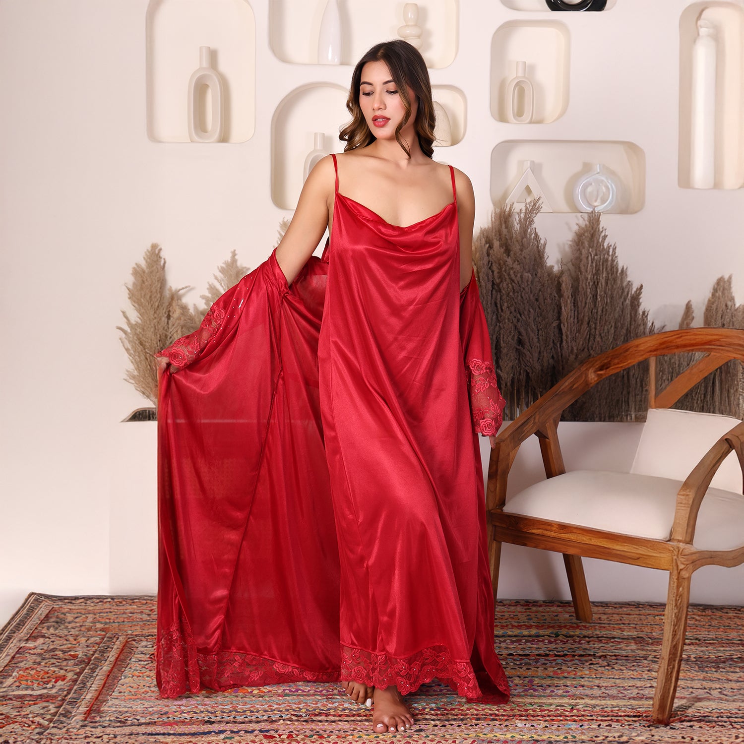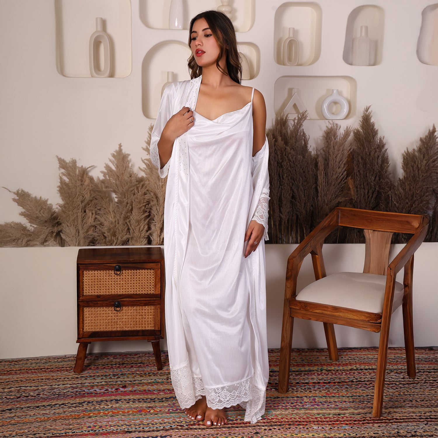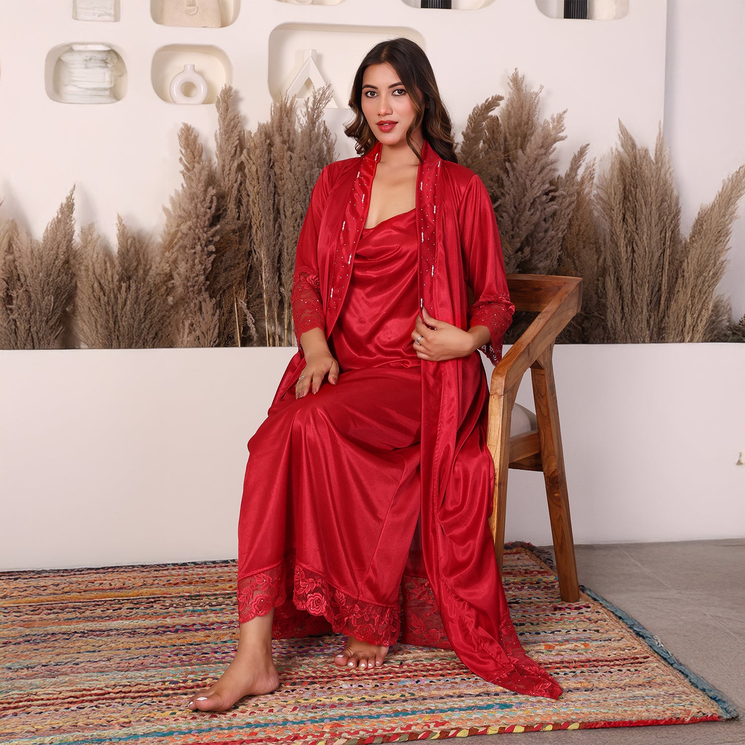 House of Elorra presents a specially designed premium satin nightdress, crafted to make every bride feel extraordinary on her most special day. This nightdress features a graceful ankle-length silhouette, soft flowing sleeves, delicate lace trims and a relaxed robe-style fit that flatters every figure. The luxurious satin fabric is feather-light and smooth- perfect for soothing bridal mornings and creating unforgettable moments. Hand worked shimmering Swarovski crystals add a touch of luxury and timeless elegance to the dress.