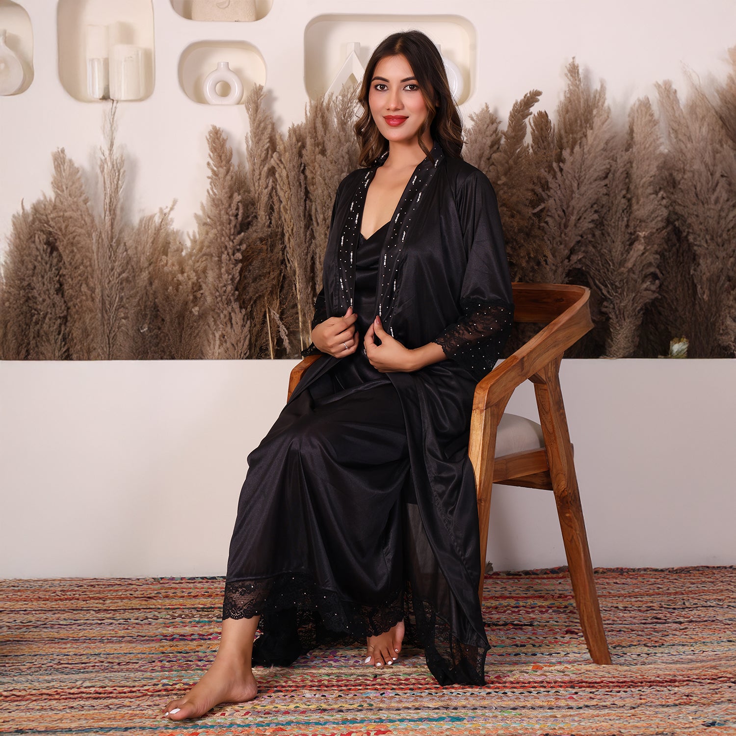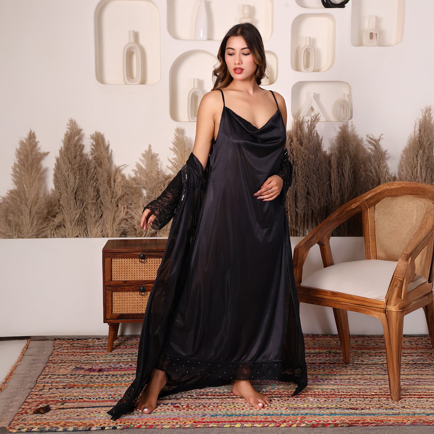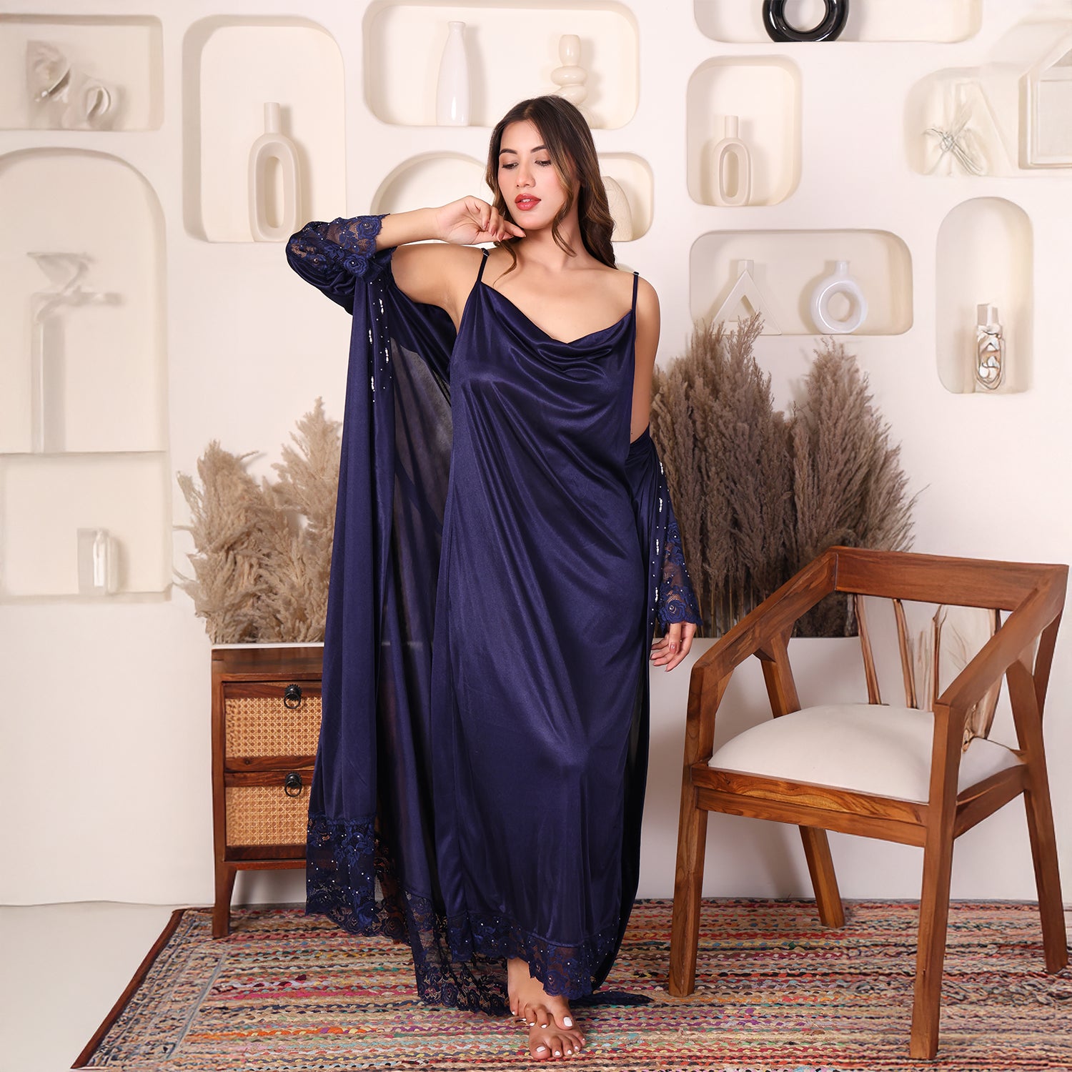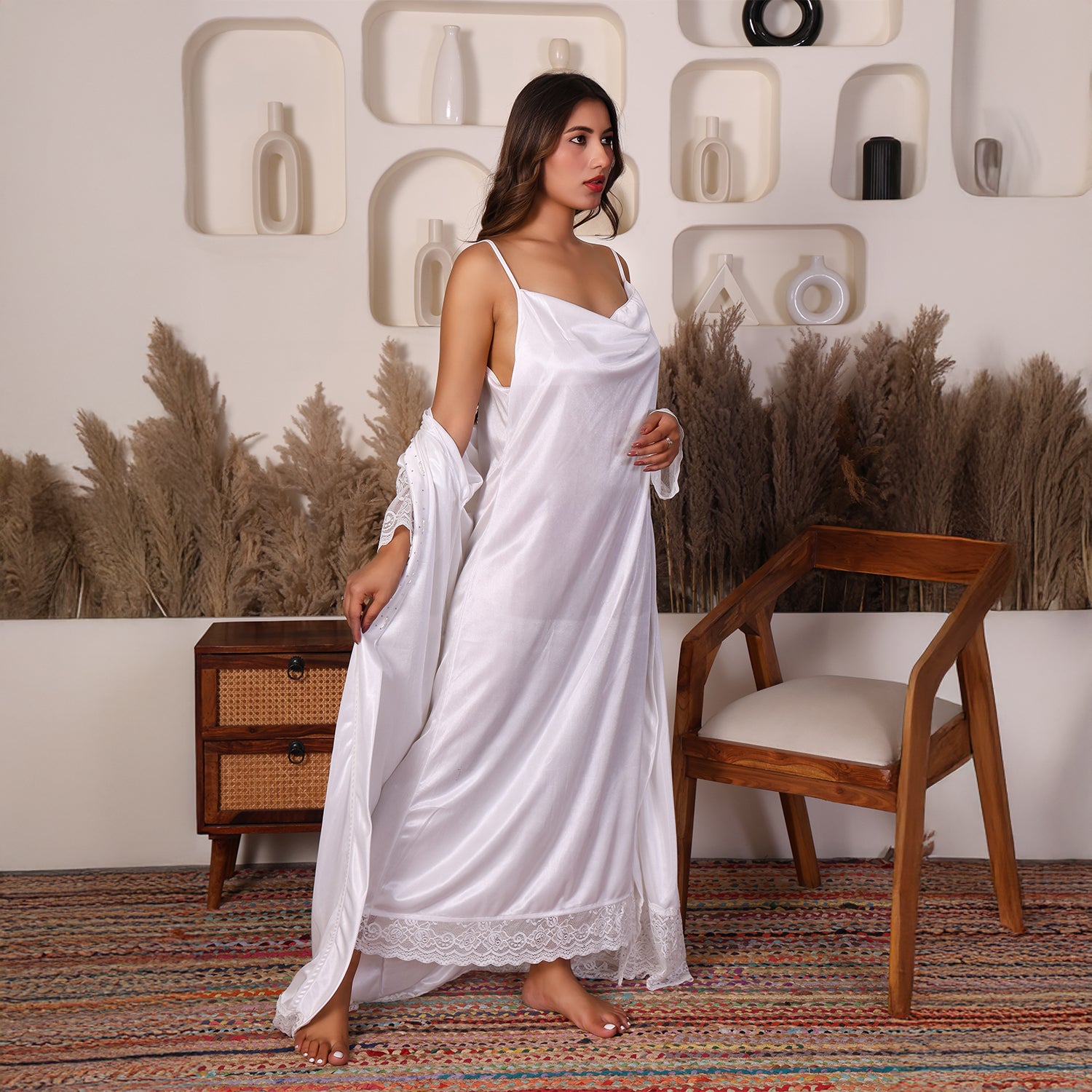 House of Elorra presents a specially designed premium satin nightdress, crafted to make every bride feel extraordinary on her most special day. This nightdress features a graceful ankle-length silhouette, soft flowing sleeves, delicate lace trims and a relaxed robe-style fit that flatters every figure. The luxurious satin fabric is feather-light and smooth- perfect for soothing bridal mornings and creating unforgettable moments. Hand worked shimmering Swarovski crystals add a touch of luxury and timeless elegance to the dress.