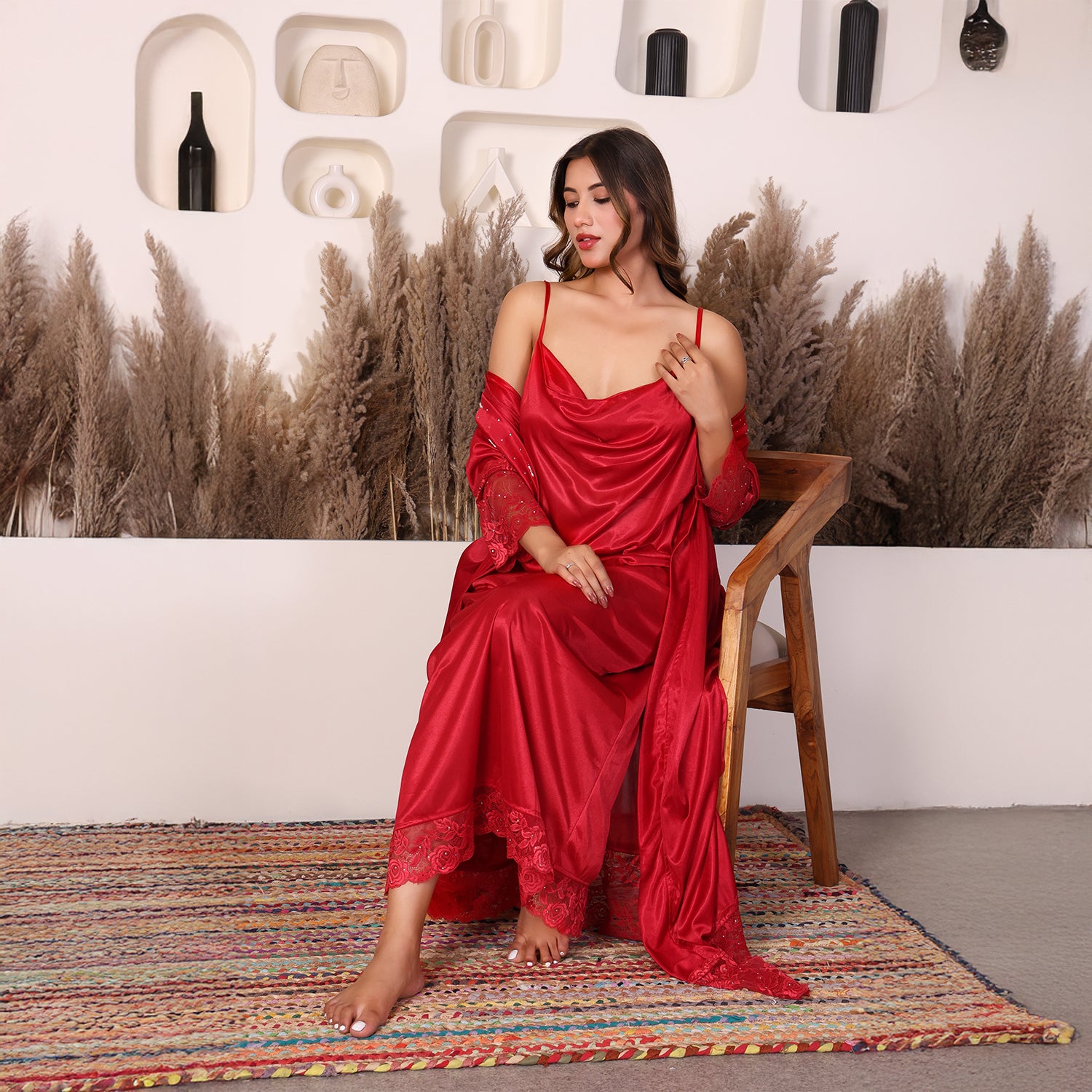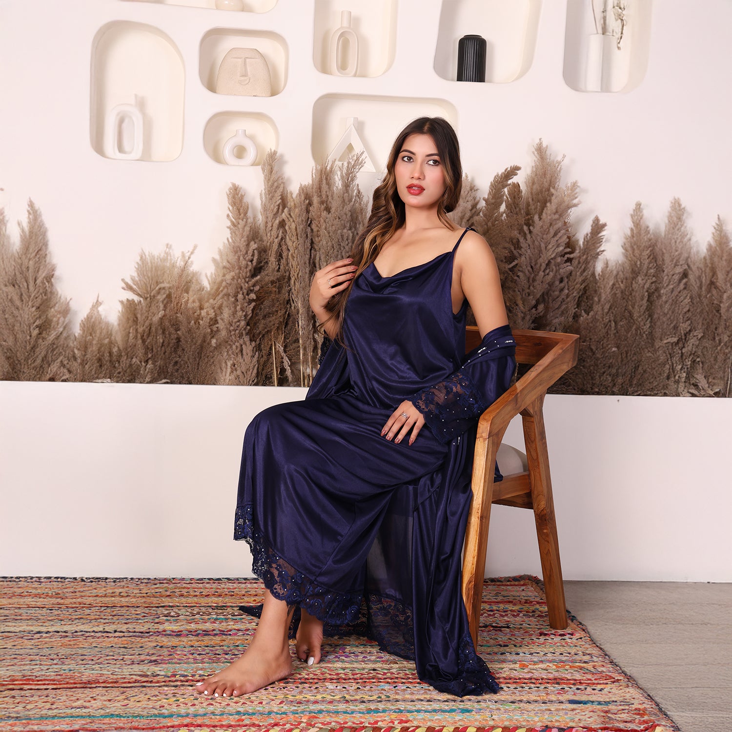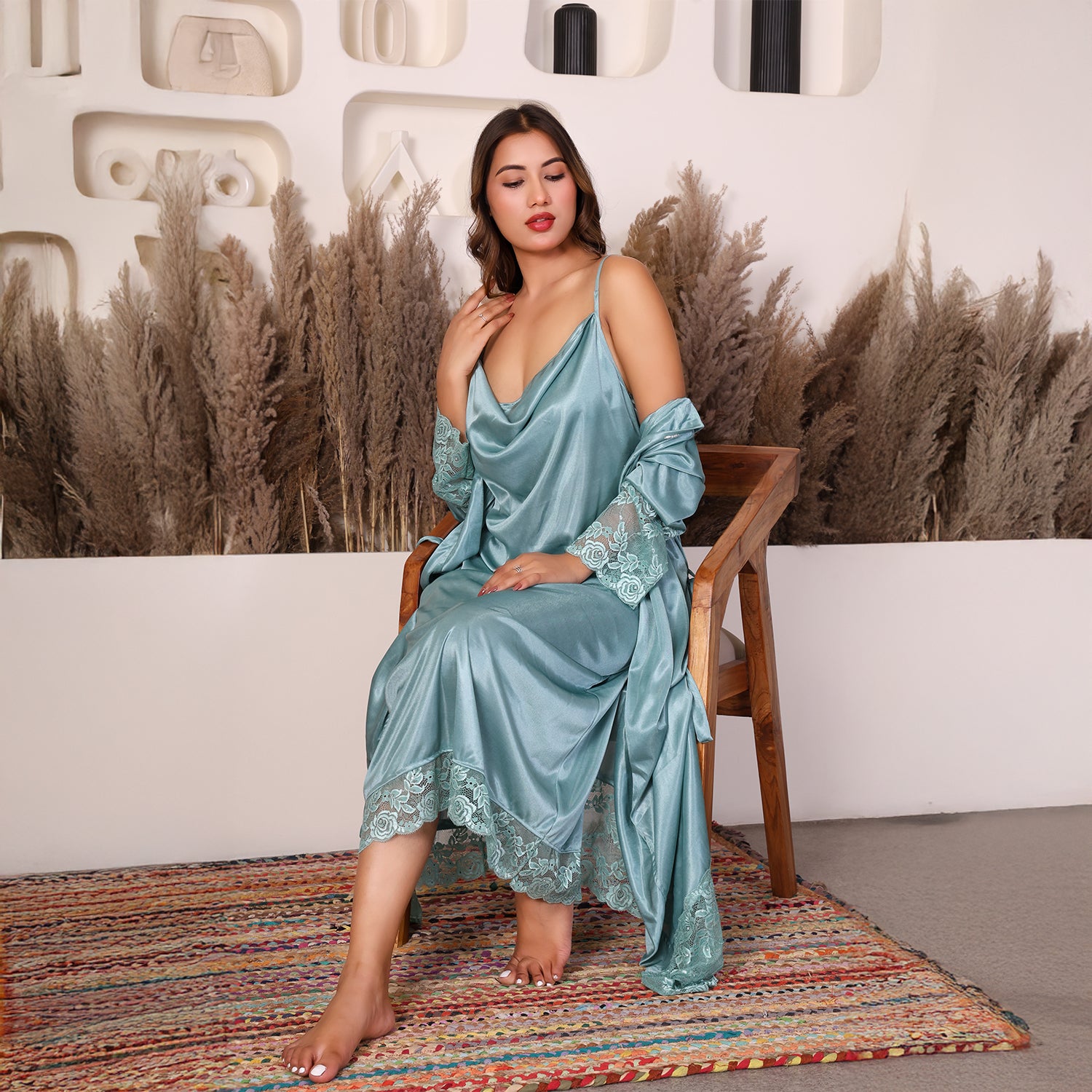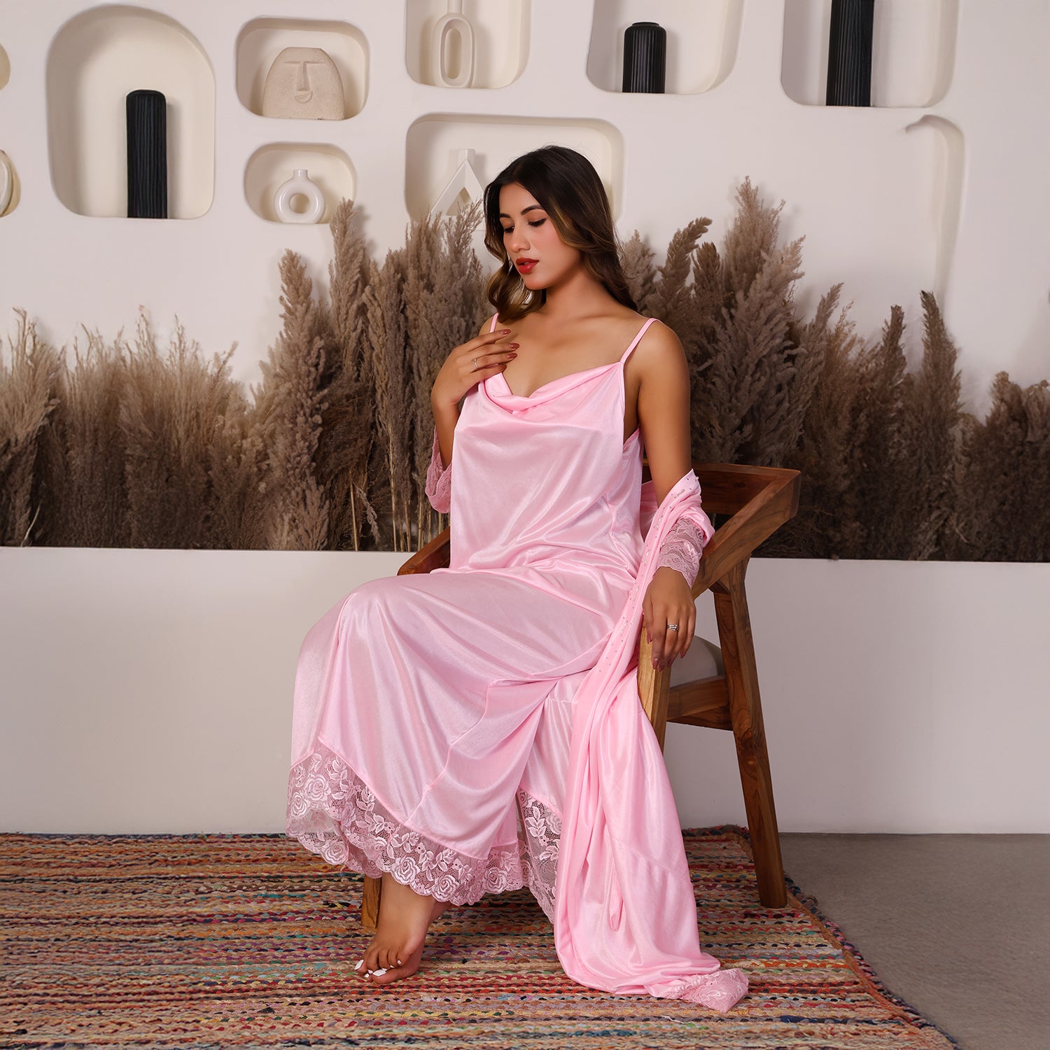 House of Elorra presents a specially designed premium satin nightdress, crafted to make every bride feel extraordinary on her most special day. This nightdress features a graceful ankle-length silhouette, soft flowing sleeves, delicate lace trims and a relaxed robe-style fit that flatters every figure. The luxurious satin fabric is feather-light and smooth- perfect for soothing bridal mornings and creating unforgettable moments. Hand worked shimmering Swarovski crystals add a touch of luxury and timeless elegance to the dress.